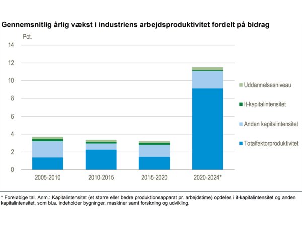 Danmarks Statistik har offentliggjort den seneste produktivitetsopgørelse, og fremhæver at i perioden 2020 til 2024 steg industriens arbejdsproduktivitet med gennemsnitligt 11,7 procent pr. år, hvilket er markant mere end tidligere perioder.