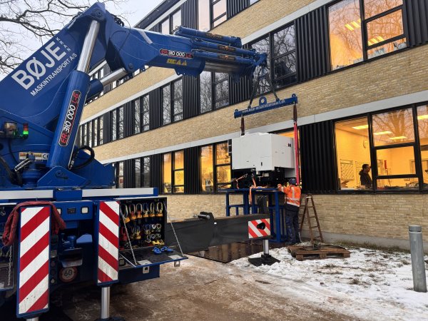 Bøjes Kran- & Maskintransport bistod, og leverede ind ad vinduet, og herefter kunne serviceteknikerne fra Flextek tage over, og slutinstallere, hvorefter den nu står på kursus i brugen af maskinen.