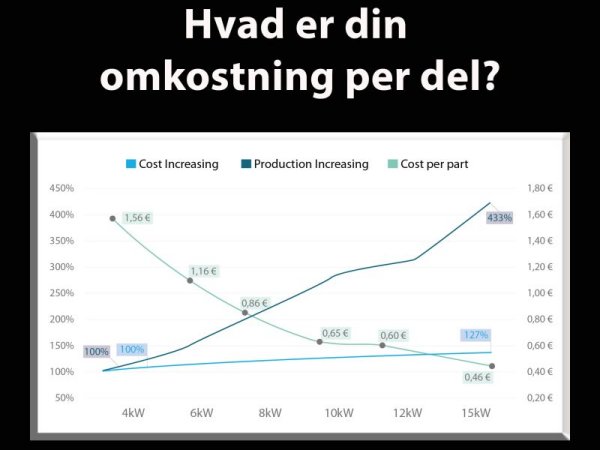Til det formål er udarbejdet en løsning, hvor man grafisk kan vise det samlede billede, så selv om maskinomkostningen stiger med effekt, vokser produktionen tilsvarende hurtigere, hvilket kan resultere i samlede lavere omkostninger pr. emne og mere tilgængelig kapacitet samt større fleksibilitet til yderligere ordrer, påpeger Eagle Scandinavia.