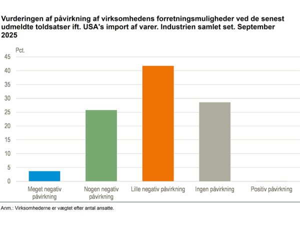 Danmarks Statistiks udsendte konjunkturbarometer for erhvervene september har opgjort, at 71,4 procent af de danske industrivirksomheder vurderer, at de i en eller anden grad er påvirket af de senest udmeldte toldsatser på import af varer i USA.